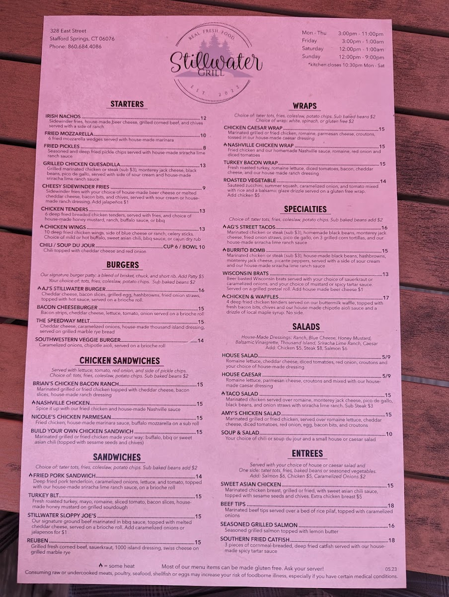 Welcome to Stillwater Grill, a hidden gem in Stafford Springs, CT, where culinary delights await. The menu boasts mouthwatering entrees like the Chicken Street Tacos, featuring marinated chicken, black beans, and homemade pico de gallo, or the delightful Chicken & Waffles—crispy tenders on fluffy waffles, drizzled with chipotle aioli and maple syrup. For seafood lovers, the Fish Tacos highlight perfectly grilled haddock with zesty slaw.
